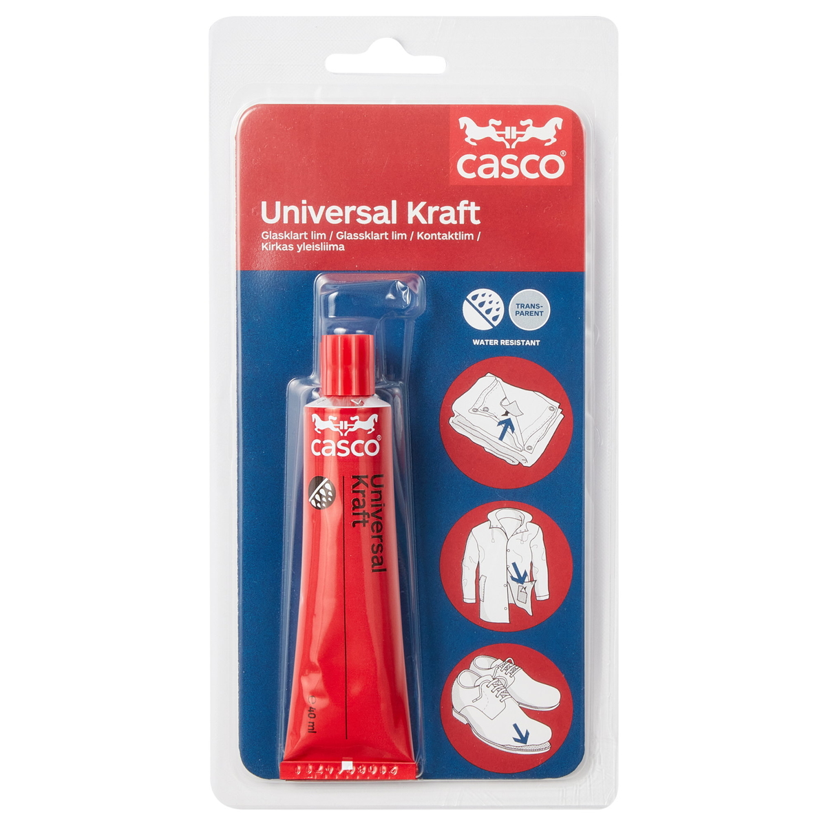 Universal Kraft, ett allroundlim från Casco. Kan användas för trä, porslin, glas, keramik, läder, metall, plast och även mjuka PVC-material, t ex regnkläder. Passar även till limning av presenningar. God beständighet mot olja, bensin, vatten och hushållskemikalier. Innehåller ej toluen. Tub 40 ml.