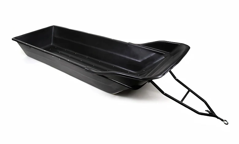 Den här pulkan är en generöst tilltagen modell utrustad med både dragstång och snöskydd. Den robusta och fjädrade dragstången gör det enkelt att koppla pulkan till en snöskoter eller fyrhjuling och smidigt transportera stora lass. Snöskyddet i fronten förhindrar att snö yr in i pulkan under färd och kan vid behov tas av. För att förbättra glidförmågan och minimera slitage på botten är pulkan försedd med separata skenor för bättre glid framåt och inget glid i sidleds.