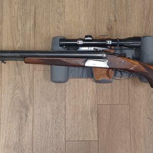 Drillingen är i använt skick med två pipor i kal. 12 och en i 5,6x52R, det sitter kikarsikte Weaver K2,5-1 moterat på en glidskena.
