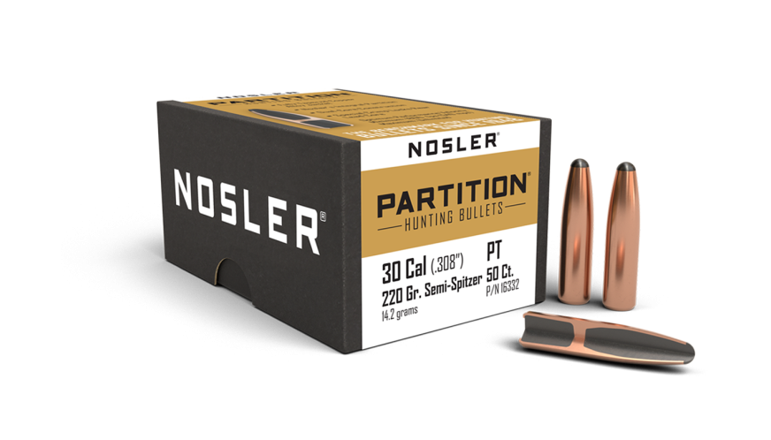 Nosler Partition® är konstruerad med en helt avsmalnande kopparlegeringsmantel som brister omedelbart vid anslag och böjer manteln jämnt utåt. Dubbelkärndesignen säkerställer snabb expansion av den främsta kärnan medan Noslers integrerade skiljevägg stöder den expanderade svampformade ytan, vilket gör att den inneslutna bakre kärnan förblir intakt och bibehåller mer än två tredjedelar av den ursprungliga kulvikten för djup penetration. Nosler Partition®s speciella blylegeringsdubbelkärna ger överlägsna svampformade egenskaper vid praktiskt taget alla anslagshastigheter i alla spel.