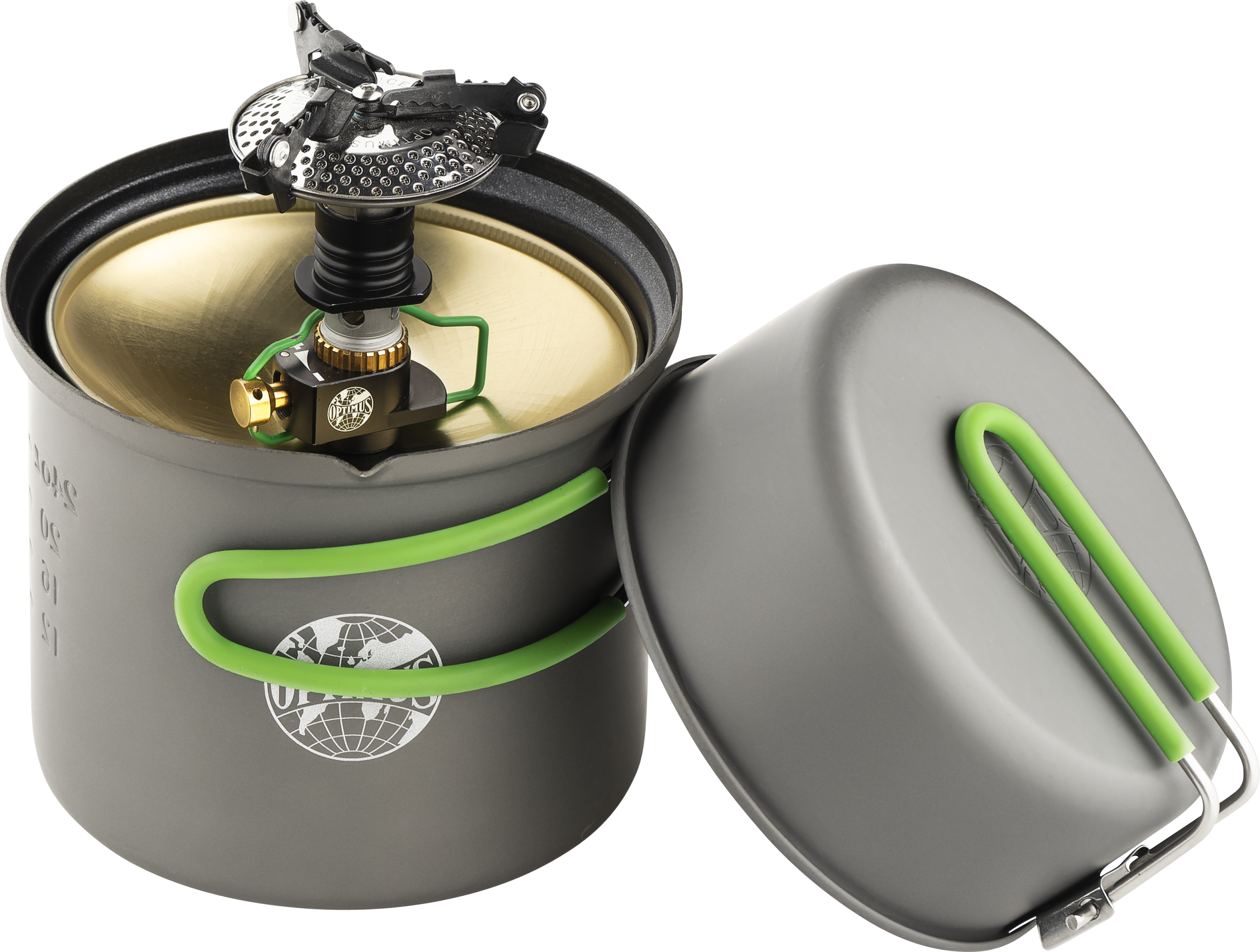 Kastrullen är tillverkad i hårdanodiserad aluminium med non-stick-beläggning och rymmer 0,95 liter. Den integrerade värmeväxlaren i botten förbättrar energieffektiviteten och minskar bränsleförbrukningen, vilket gör systemet både ekonomiskt och effektivt i fält.