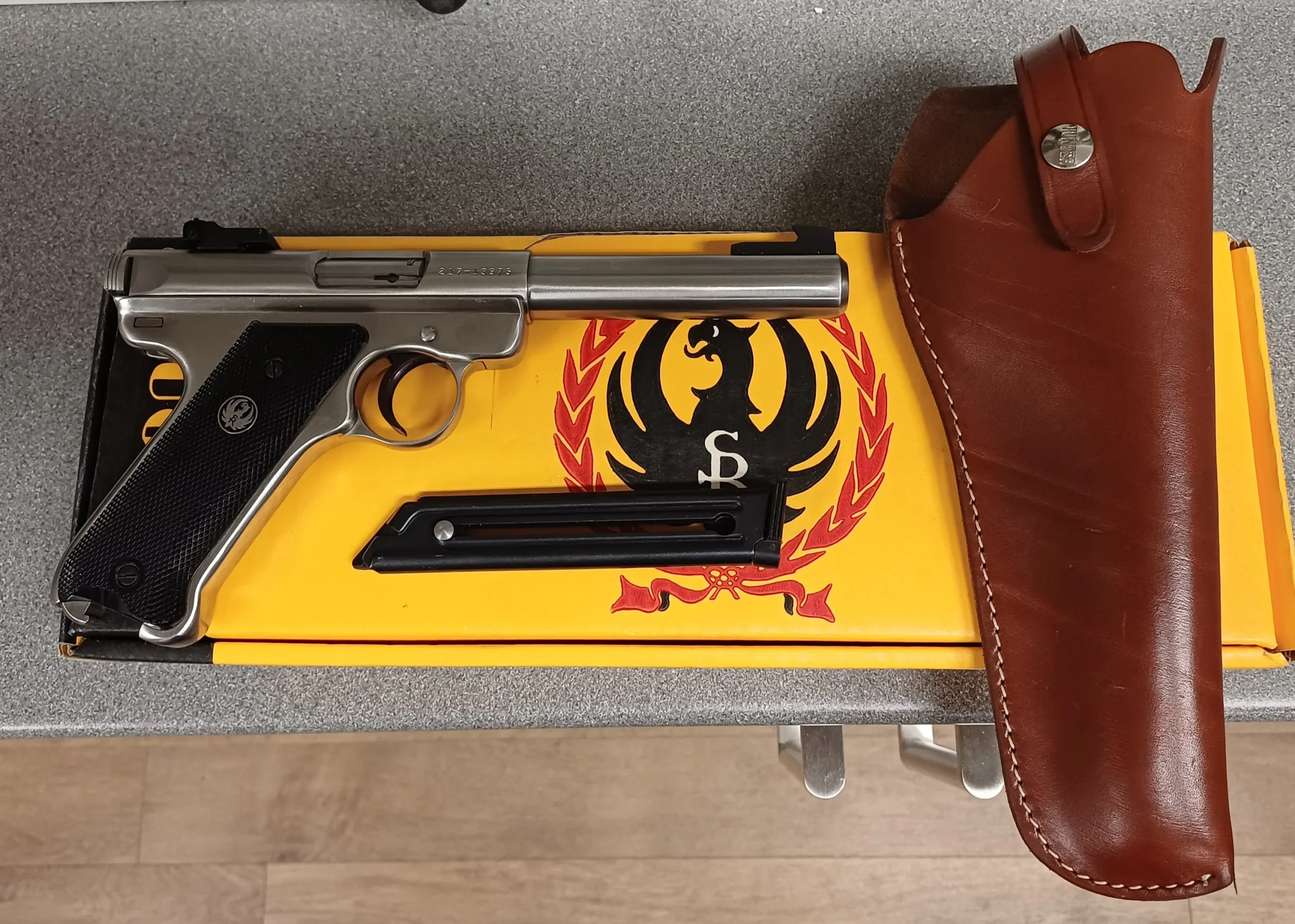 Pistolen är mycket bra skick och skjuter väldigt bra, det följer med ett läderfodral också.