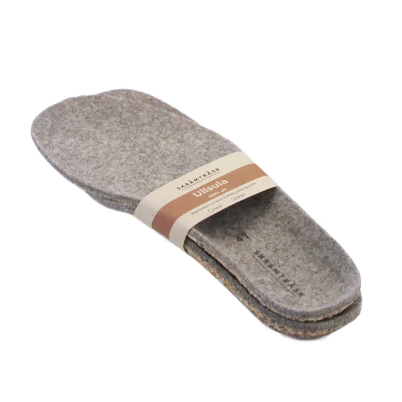 Varma sulor i 100% ull, formpressade med botten av kork och återvunnet gummi. Ullen har god isoleringsförmåga och håller fötterna torra och varma. Sulorna kan med fördel användas året runt då ullfilten som består av 100% ull andas mycket bra. Tillverkas i Portugal för Skråmträsk sko.