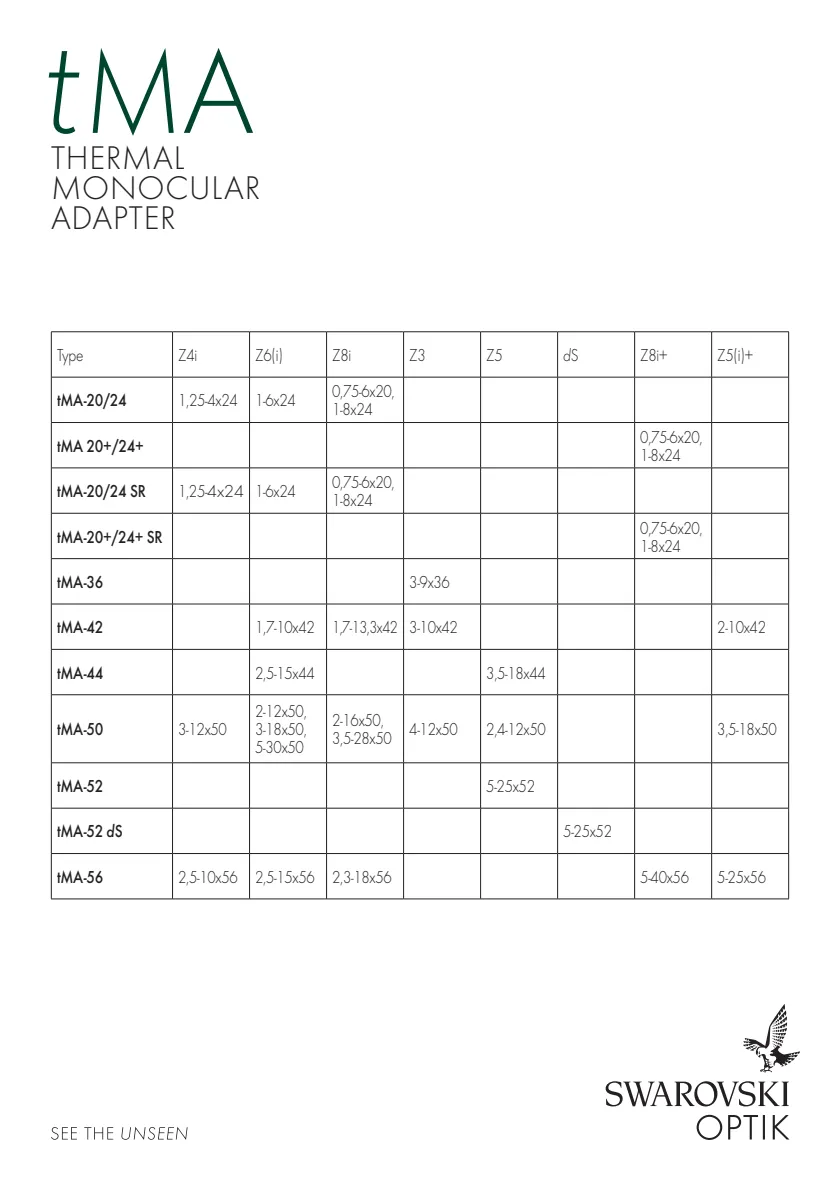 Den termiska monokulära adaptern tMA är kompatibel med SWAROVSKI OPTIK Z8i, Z6i, Z5(i) och Z3 kikarsikten. Undantag: tMA 24 gäller inte för 1,25-4×24, 1-6×24, 0,75-6×20 och 1-8×24 med SR.