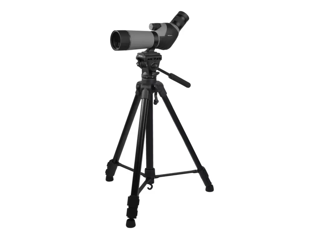 I kombination med stativet från Benro som har en bekväm arbetshöjd från 62 till 169 cm, gummerade fötter, och som klarar en tubkikare (eller kamera/videokamera) upp till 5 kg. En krok i nedre änden av mittpelaren gör att man kan hänga något tungt för att tynga ner stativet så det står stadig även i kraftig vind.